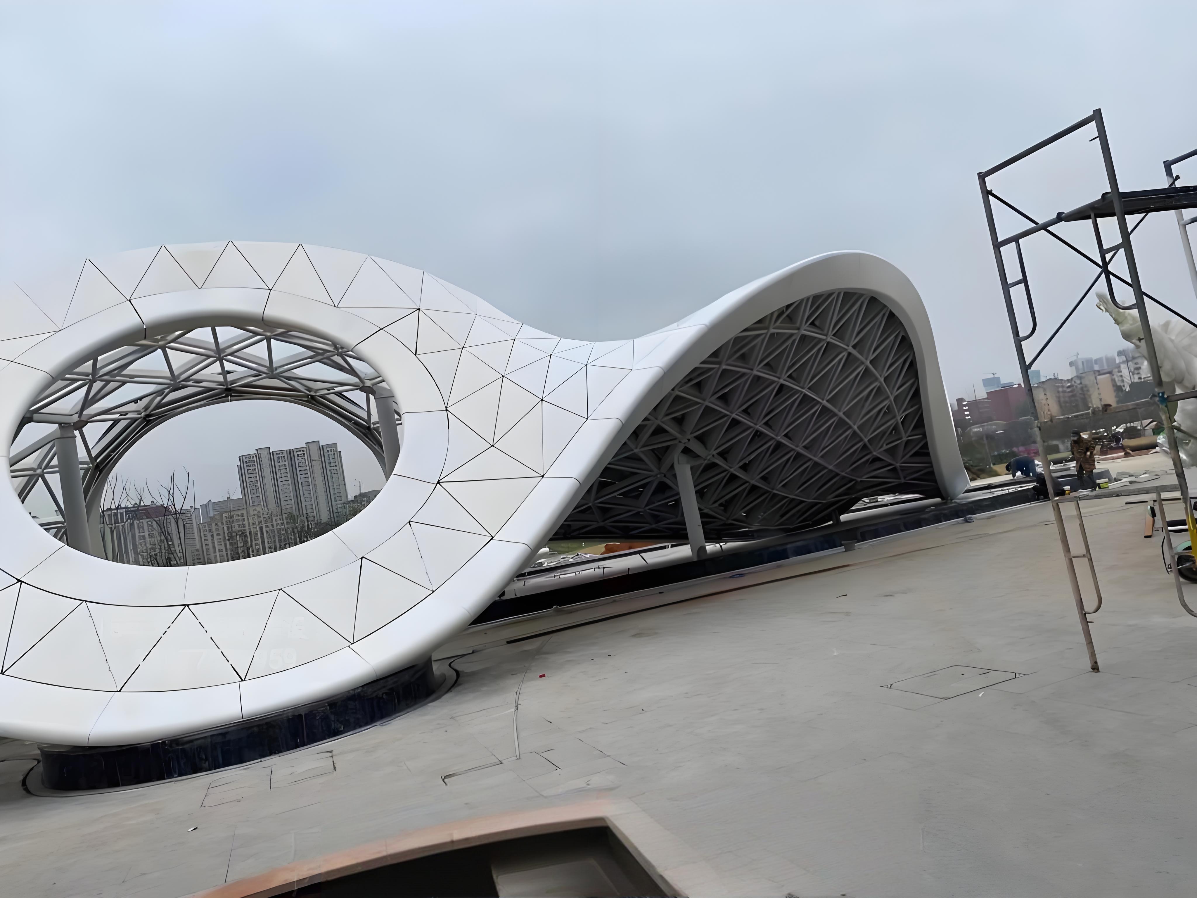 Spredbar buet aluminiumsfinér kan velge forming av metode på stedet, det vil si etter å ha kuttet og dannet aluminiums finér flatplate, etter å ha installert avstivende ribbeina og andre komponenter i fabrikken, direkte pakket og transportert til stedet, den endelige installasjonen av støping i feltet. Denne måten med aluminiumsdannende jevn overgang, kan scenen justeres for presisjon, god formende effekt, men strukturen til noden er kompleks, designen er vanskeligere.